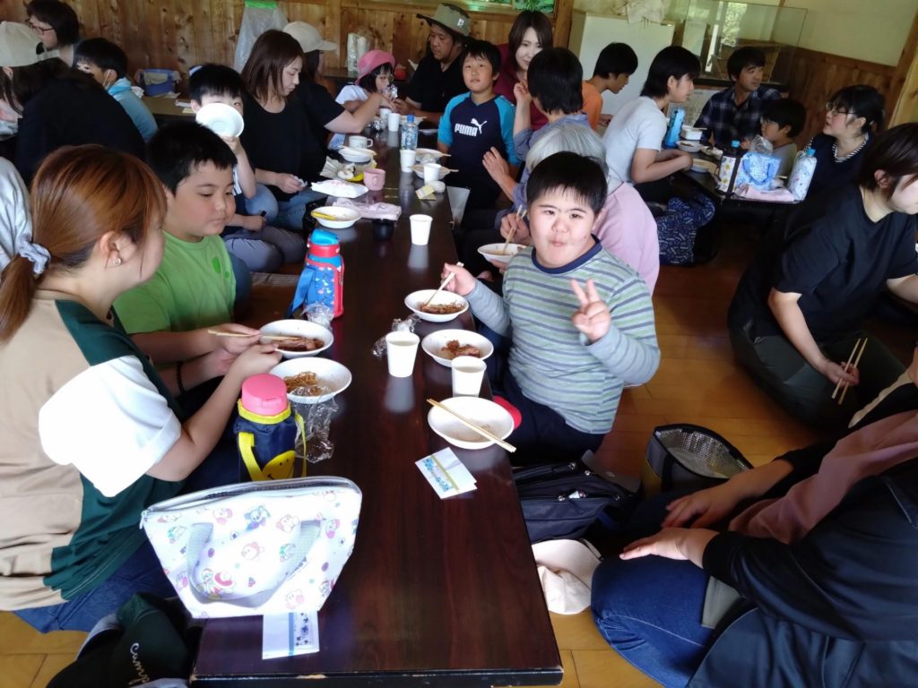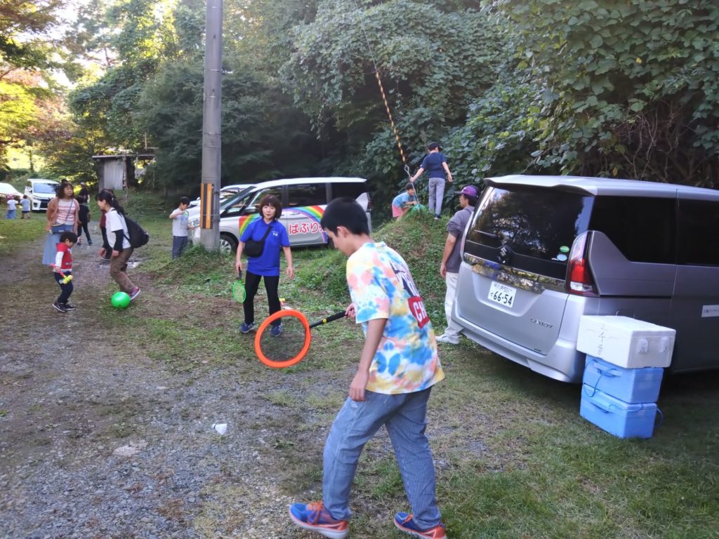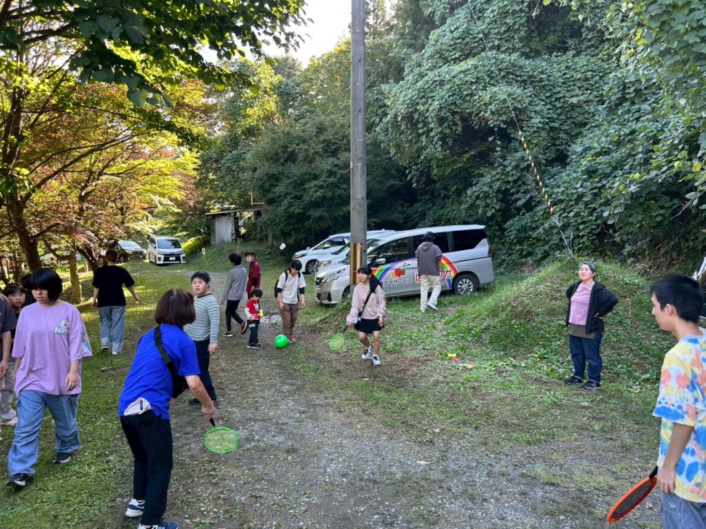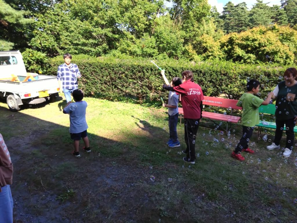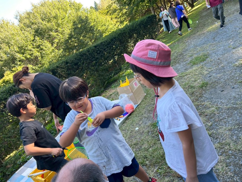 その後、昼食会場へ移動し、焼きそば、フランクフルト、焼き肉などでお腹を満たし、外でバドミントンやシャボン玉、虫取りやボール遊びもして楽しみました。