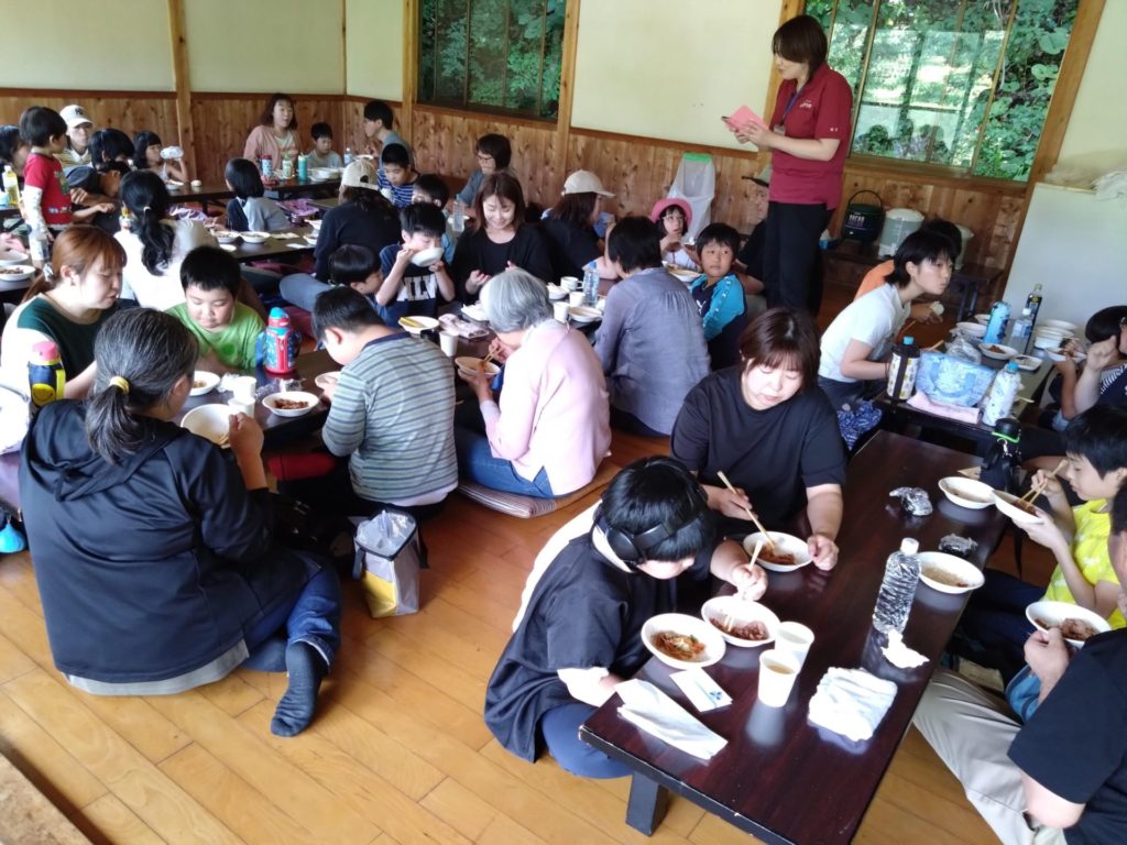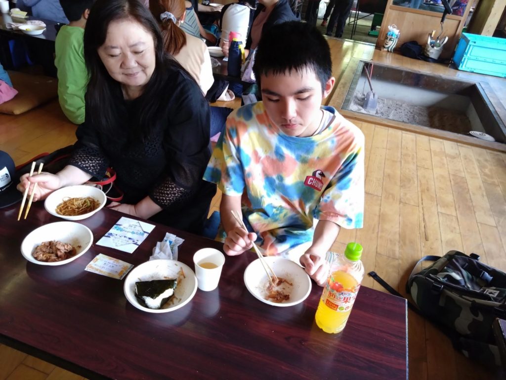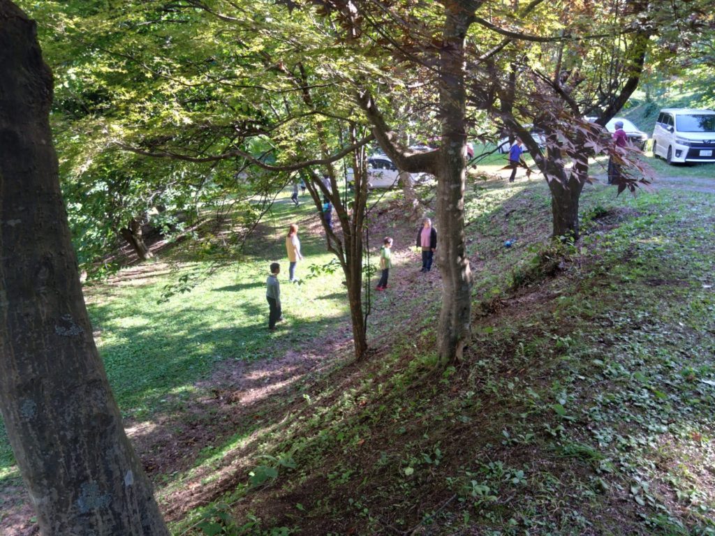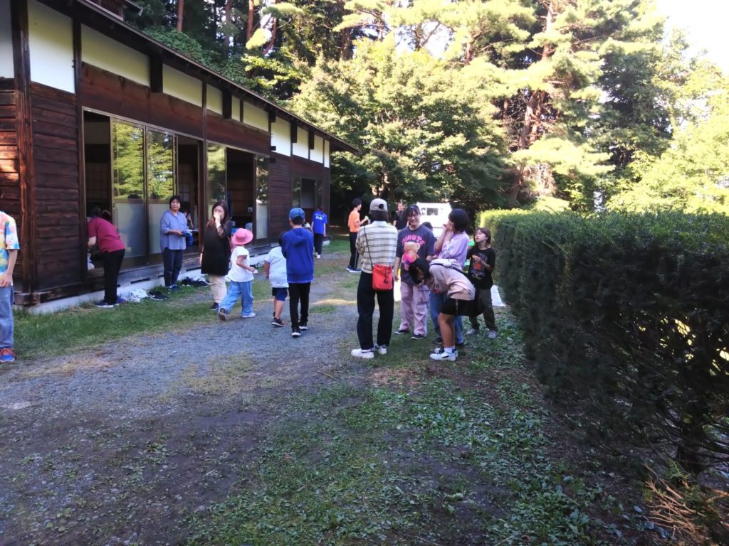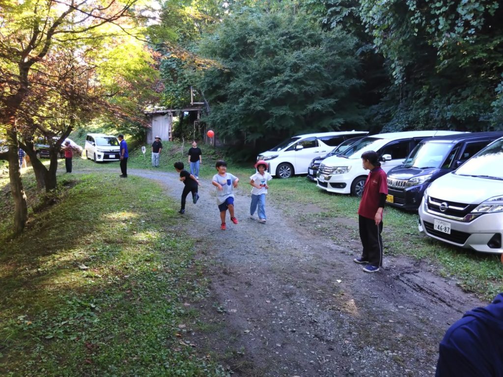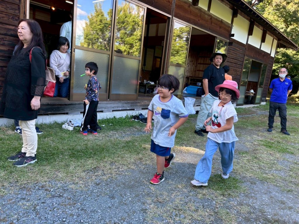 その後、昼食会場へ移動し、焼きそば、フランクフルト、焼き肉などでお腹を満たし、外でバドミントンやシャボン玉、虫取りやボール遊びもして楽しみました。