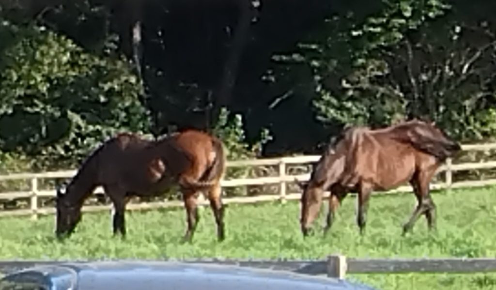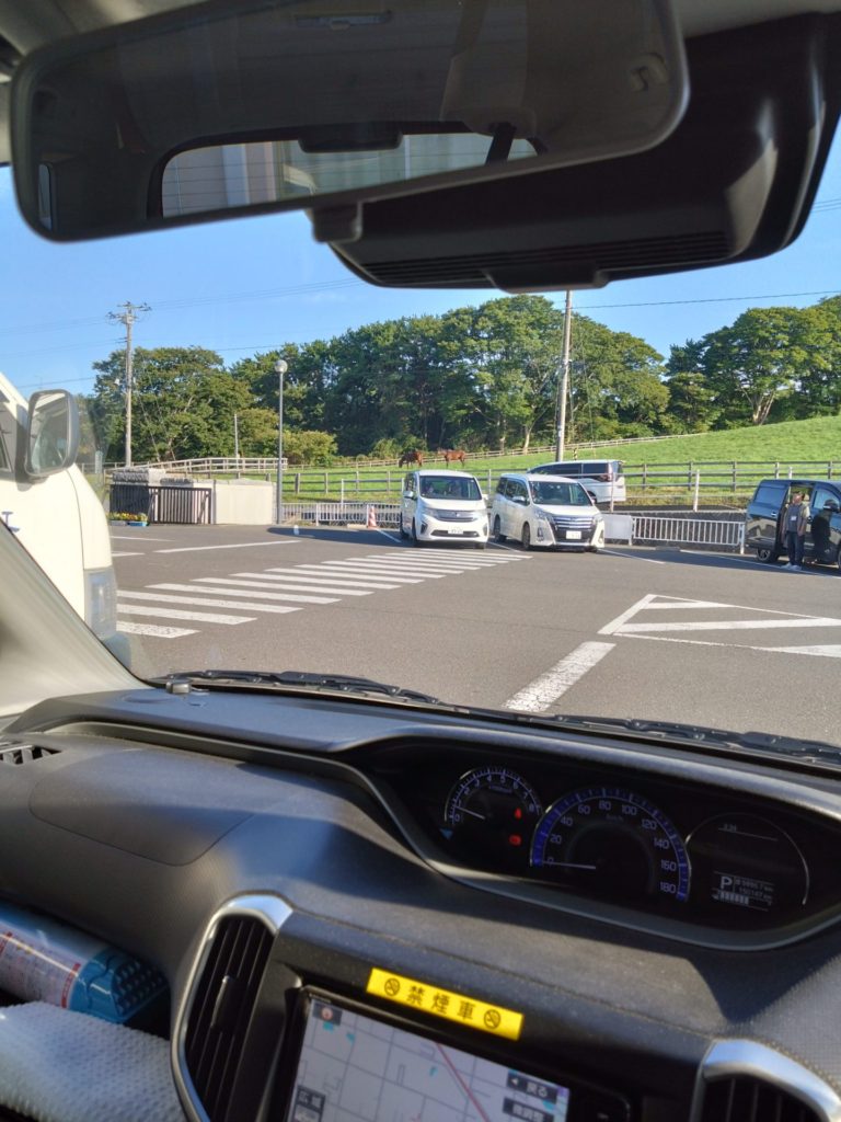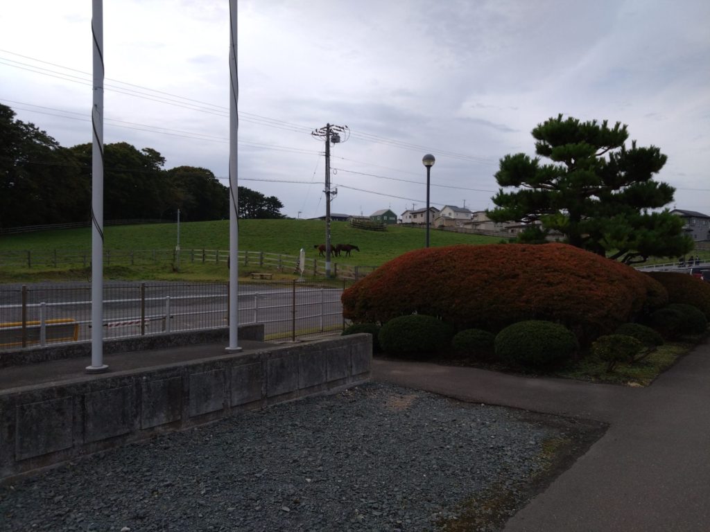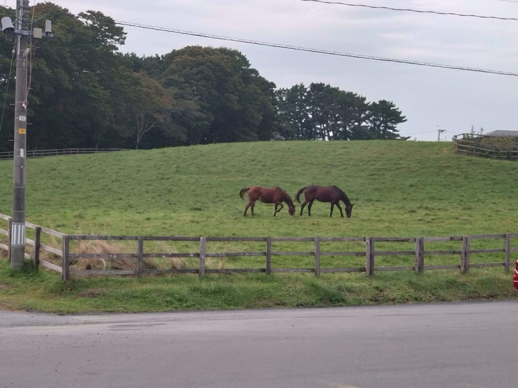 Sさんが通っている八戸高等支援学校のお隣には、タイヘイ牧場があり9月ごろから2頭の馬が姿を見せています。校舎側に駐車すると真正面に牧場の緑の芝生と仲良さそうな2頭の競走馬・・・🐎とても絵になります😊