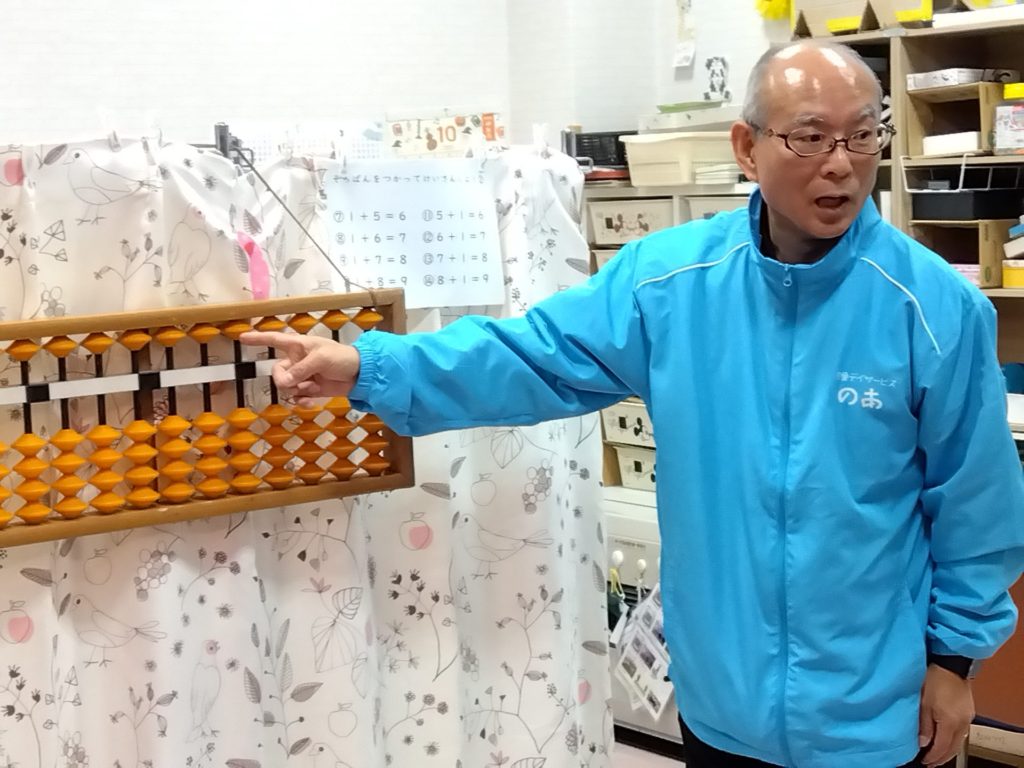 今月の療育活動は「生活」です。「○○練習」として、大きなそろばんを使いました。