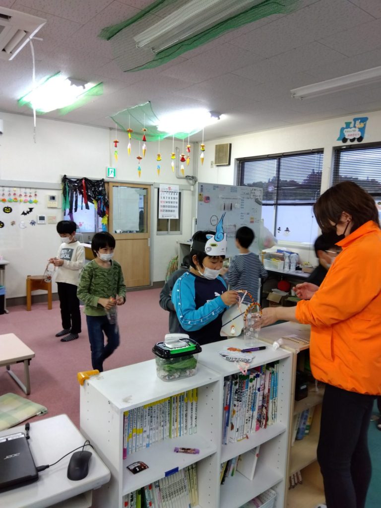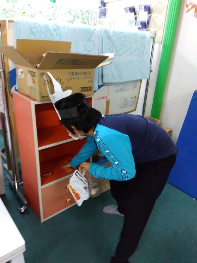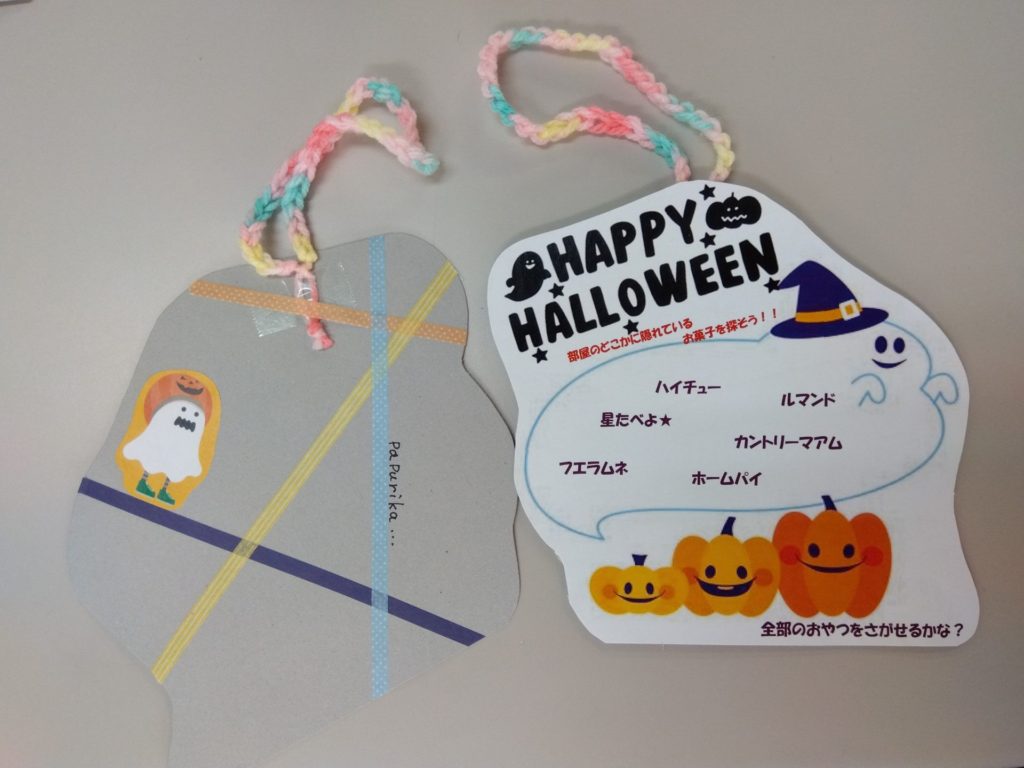 全員揃ったらお菓子入れコップのバケツと、お菓子探しのお菓子リストを渡して、支援フロアにばらまかれたお菓子を1種類ずつ探す、お菓子探しゲームをしました!!お菓子が見つかったら、スタッフの所に見つけたお菓子を持ってきて、お菓子リストにシールを貼ってもらいます。