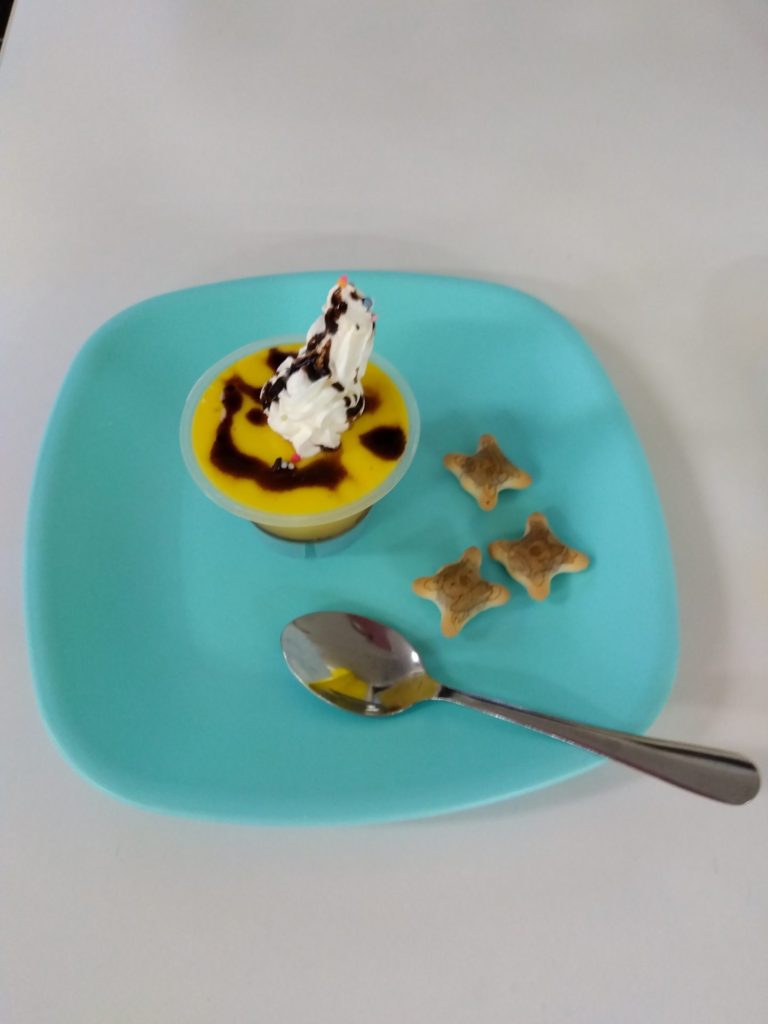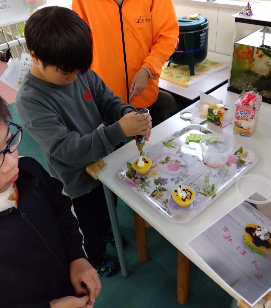 まずは宿題が終わった人から、カボチャのプリンにホイップデコ★市販のものですが、ホイップとチョコソース、スプレーをまぶして少し豪華に(^_-)-☆