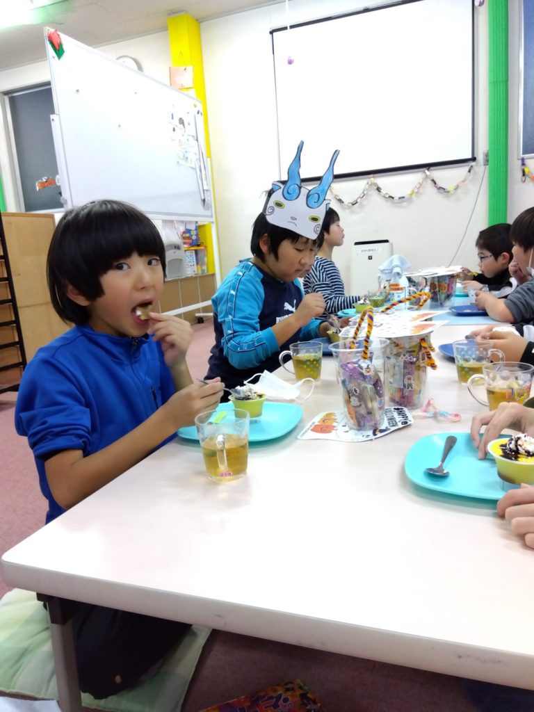 お菓子が全部見つかったら、デコったカボチャのプリンと一緒に見つけたお菓子会食タイム★