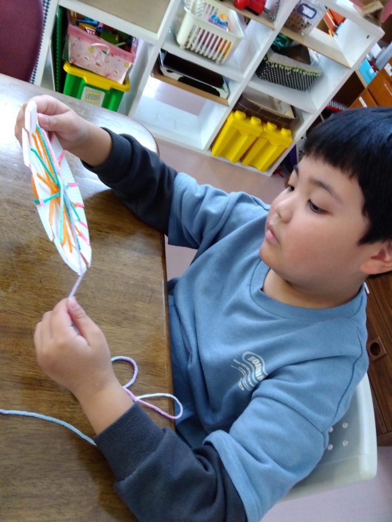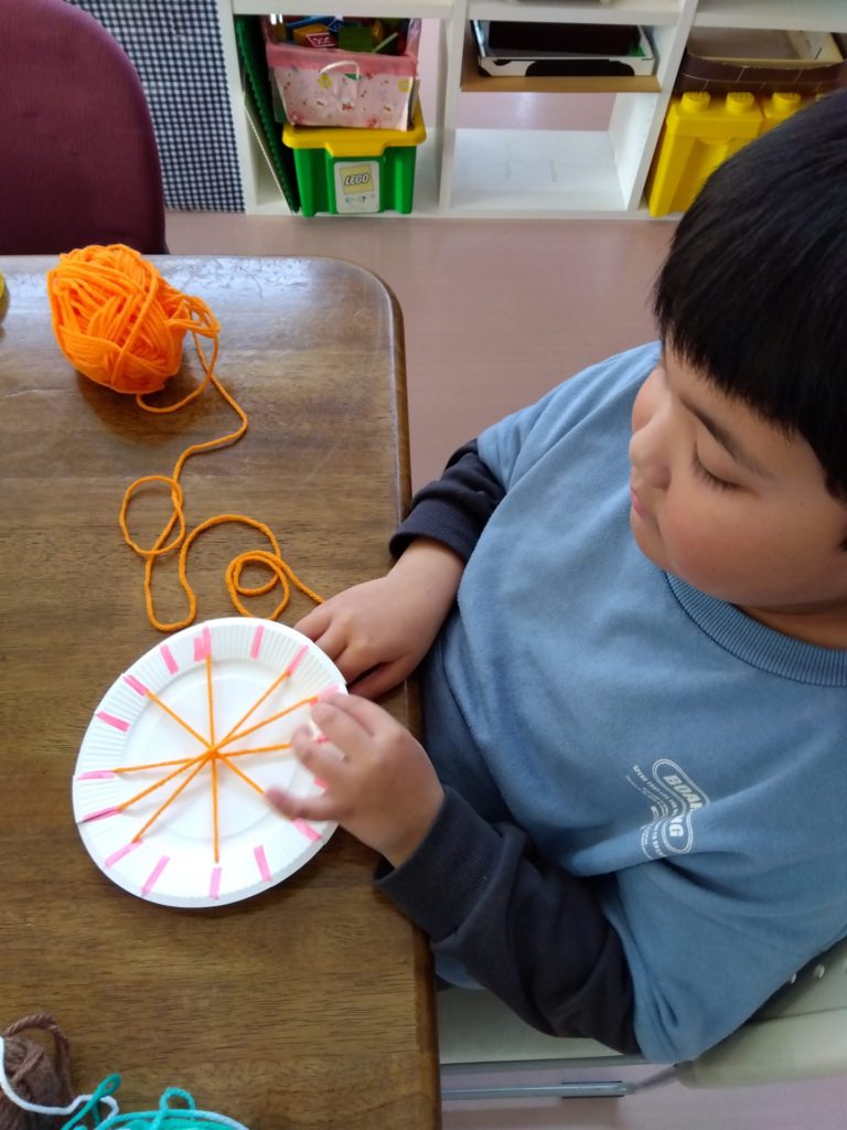「好きなように巻いていいよ!」と伝えていましたが、毛糸が模様になるように真剣に考えながら巻いていく子どもたち😊