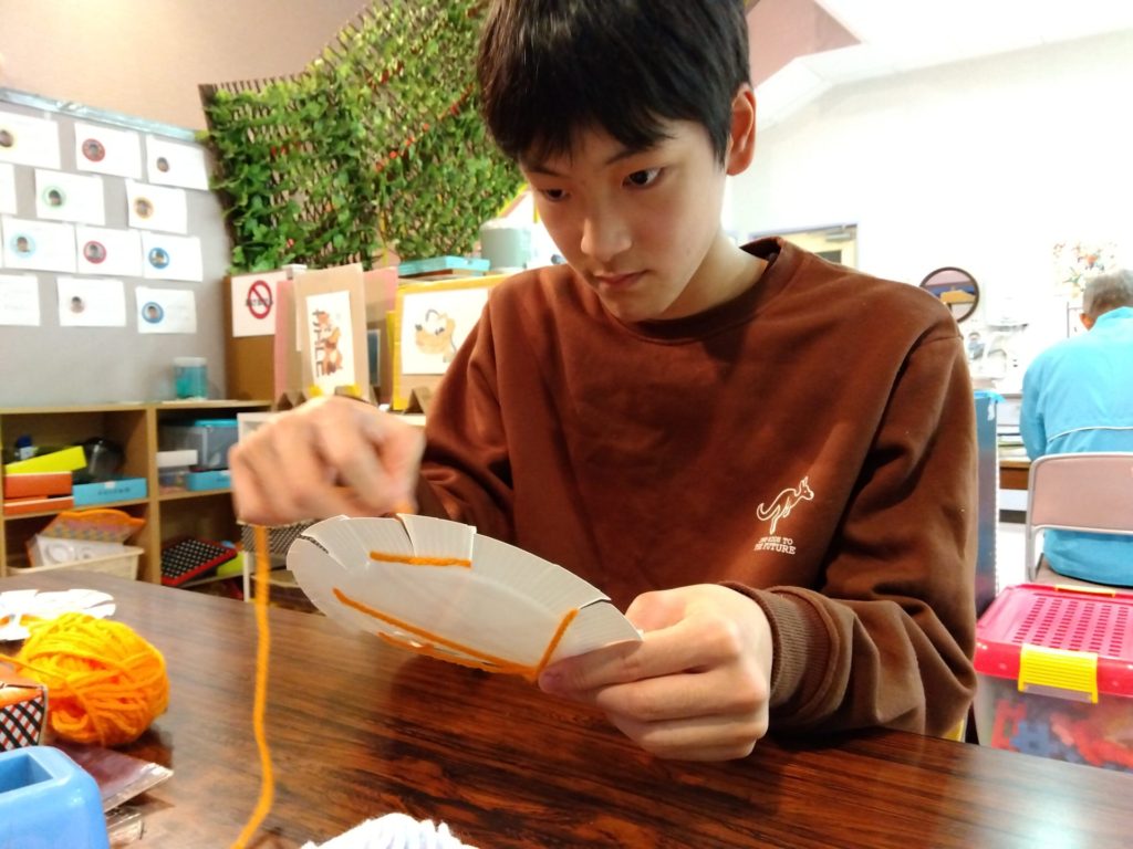 切込みの入った紙皿に毛糸を巻いていきます🧶