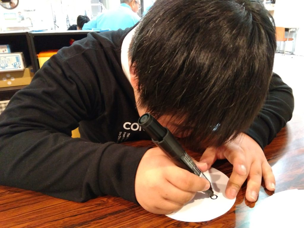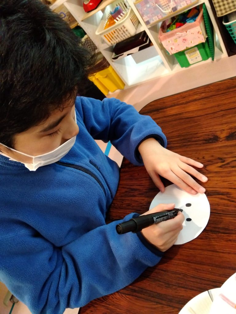 こちらは丸く切った画用紙に顔を描いたり、「何か物足りないなぁ~」と帽子を作ったりしています🎩