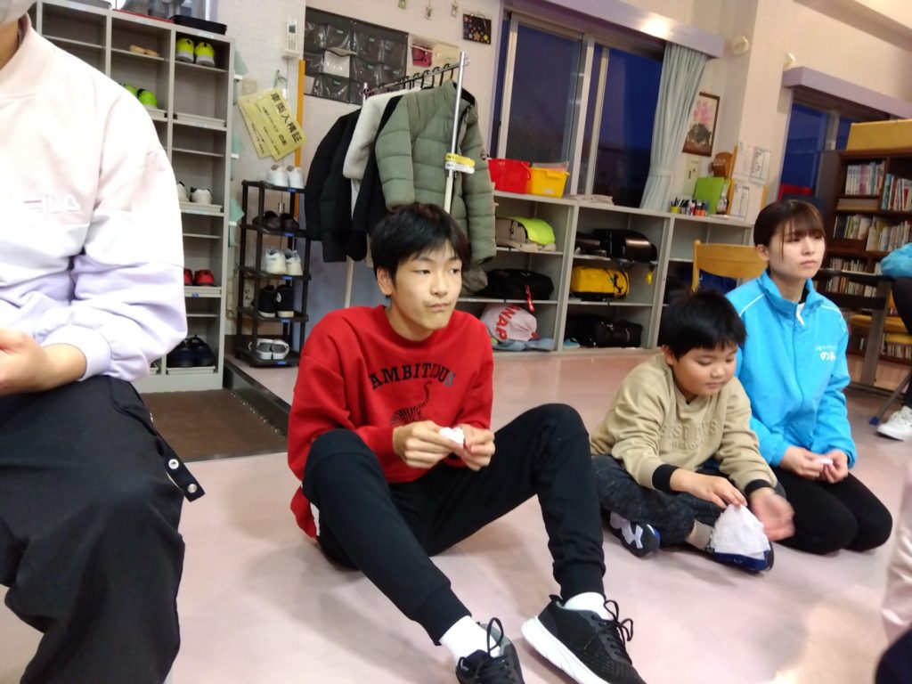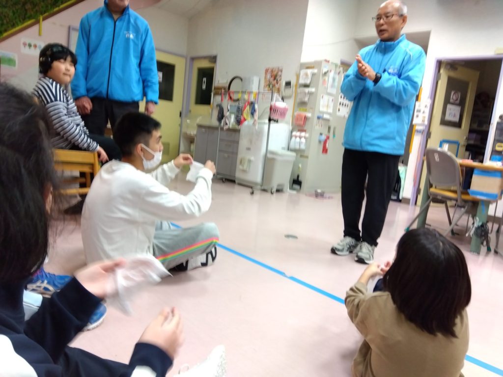 「水が出ない!」断水です。手を洗えない時はどうしますか?そんな時に便利なのが「ウェットティッシュ」です。みんなで1枚ずつ手に取ってきれいに拭く練習をしました。