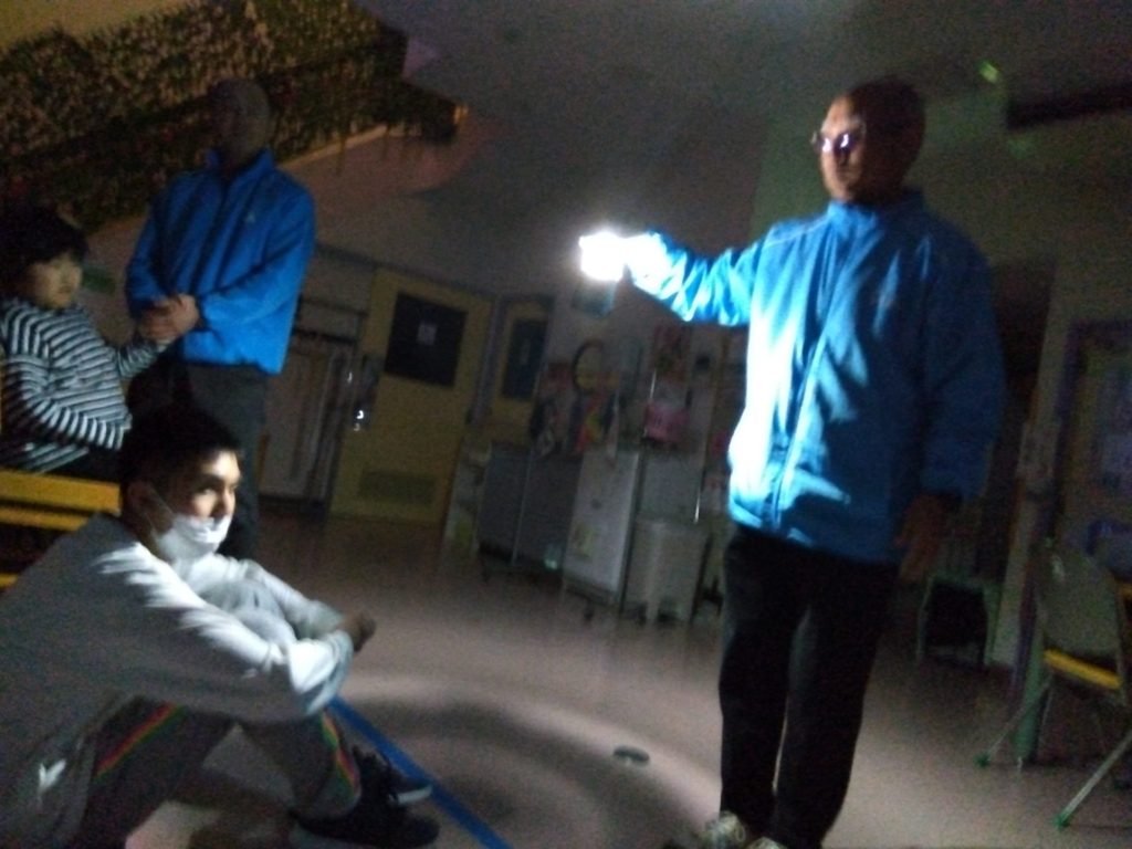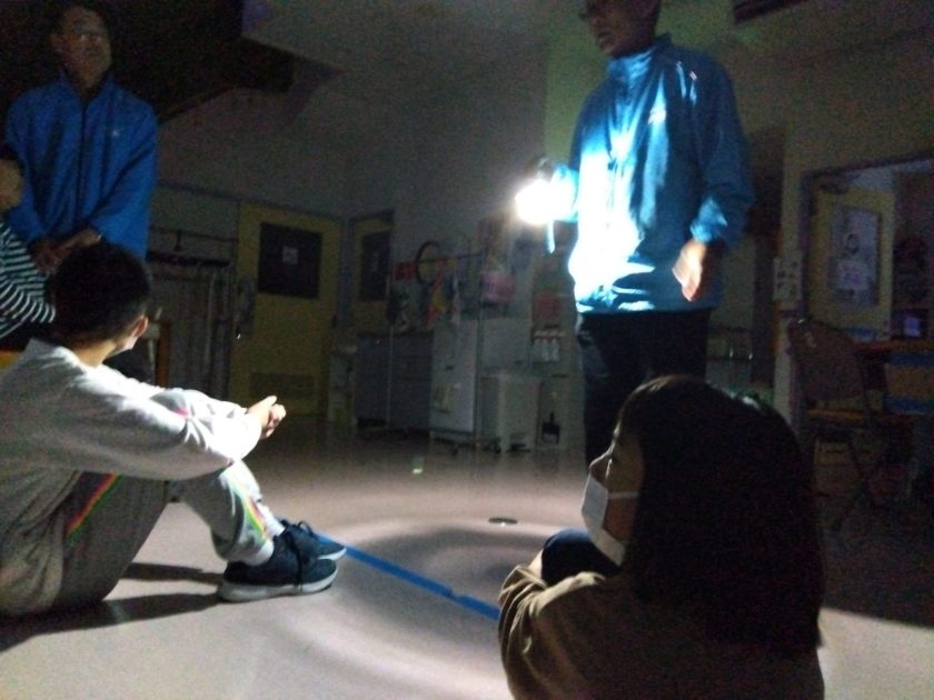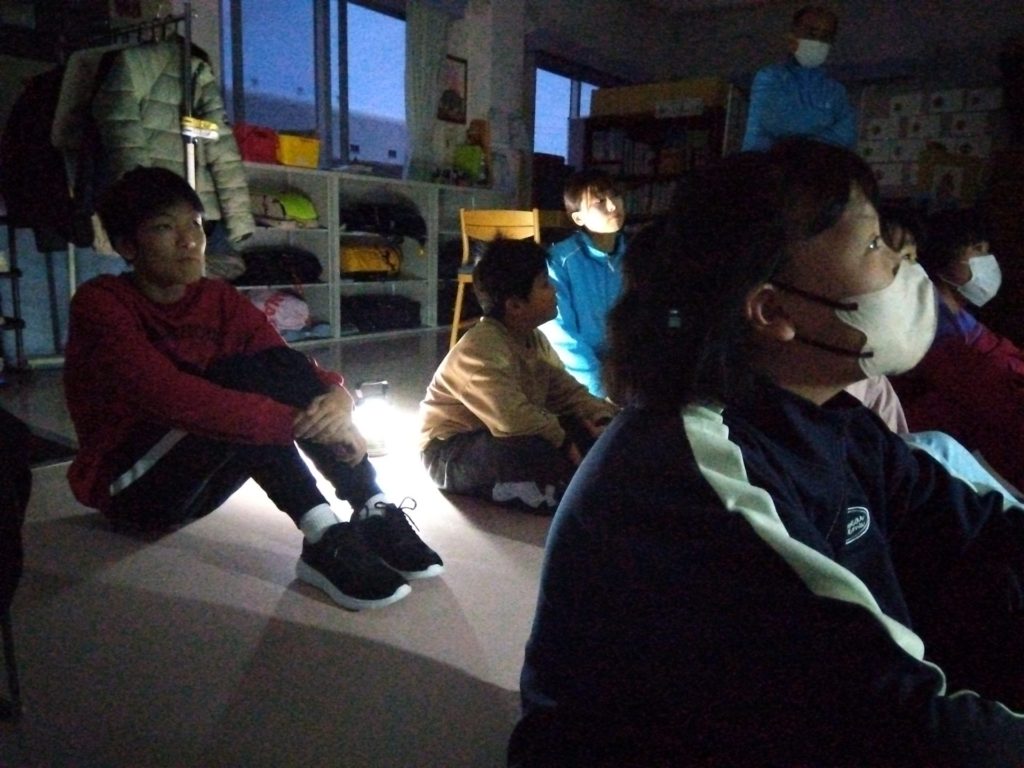 「わあ、真っ暗!」電気を全部消して停電を体験しました。