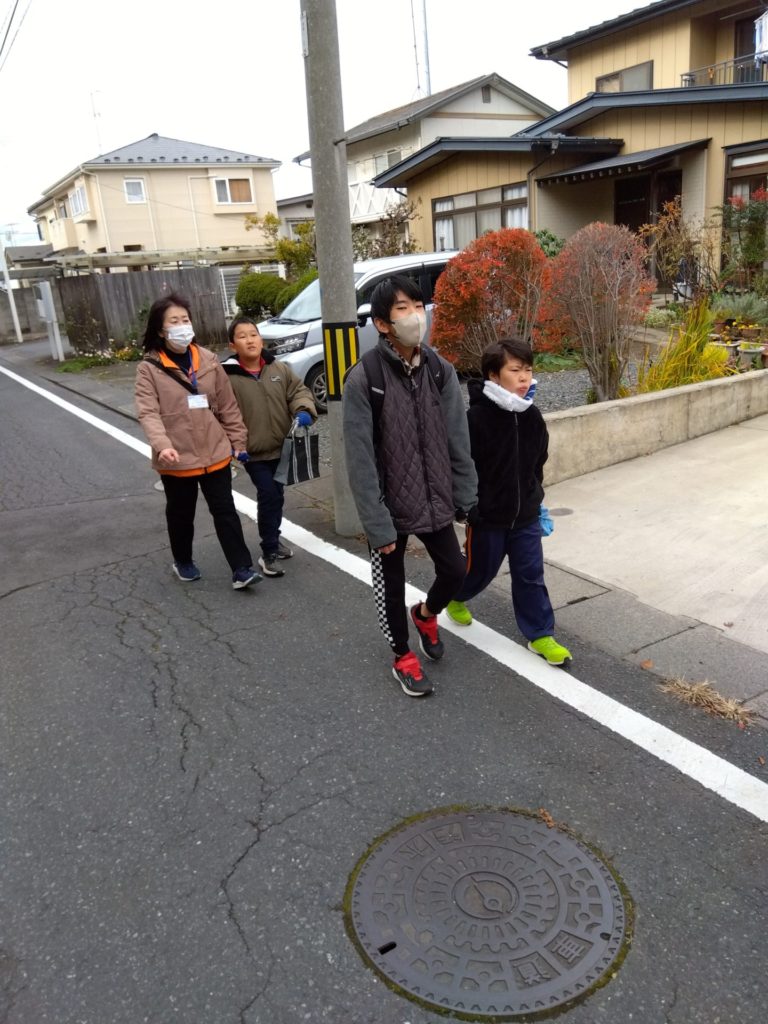 根城中学校までは、徒歩でおよそ18分程度、距離は1㎞でした。指導員と手をつないで信号機のある交差点を横断して歩道を歩く練習もしました。横断を優先させてくださったドライバーさんには「ありがとうございます」のお礼の気持ちを伝えることができました。そして、根城中学校に到着。