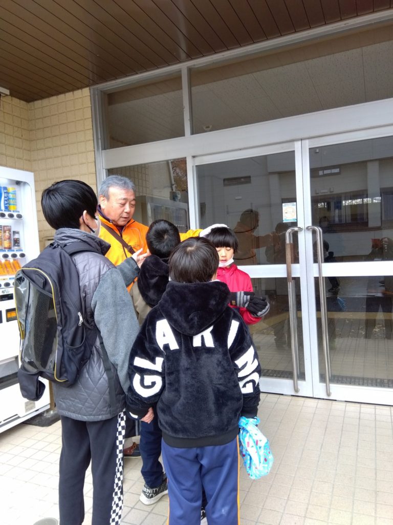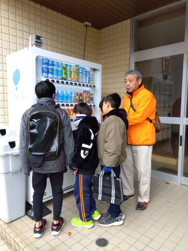 避難場所となる体育館玄関から中の様子をのぞき見…。「ここが避難場所ですよ。」の支援員の話には特にリアクションはなく、玄関にある自動販売機に興味津々…。