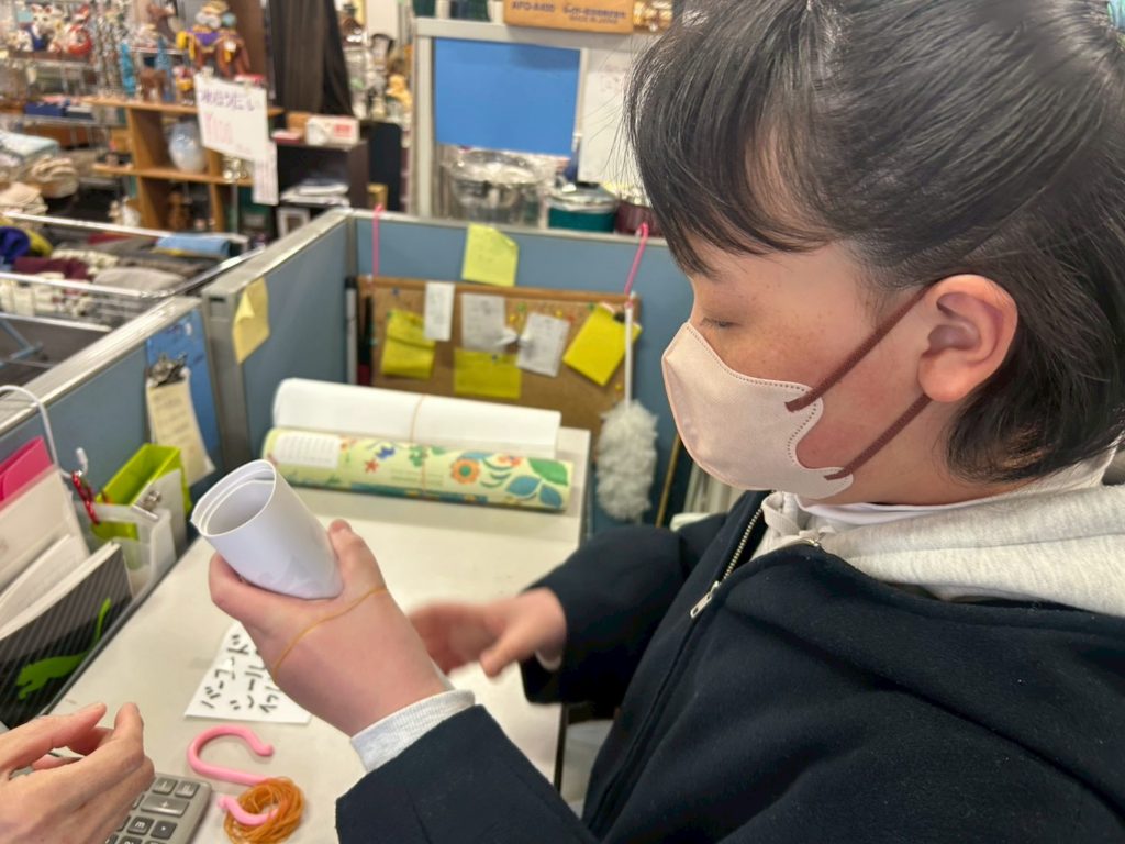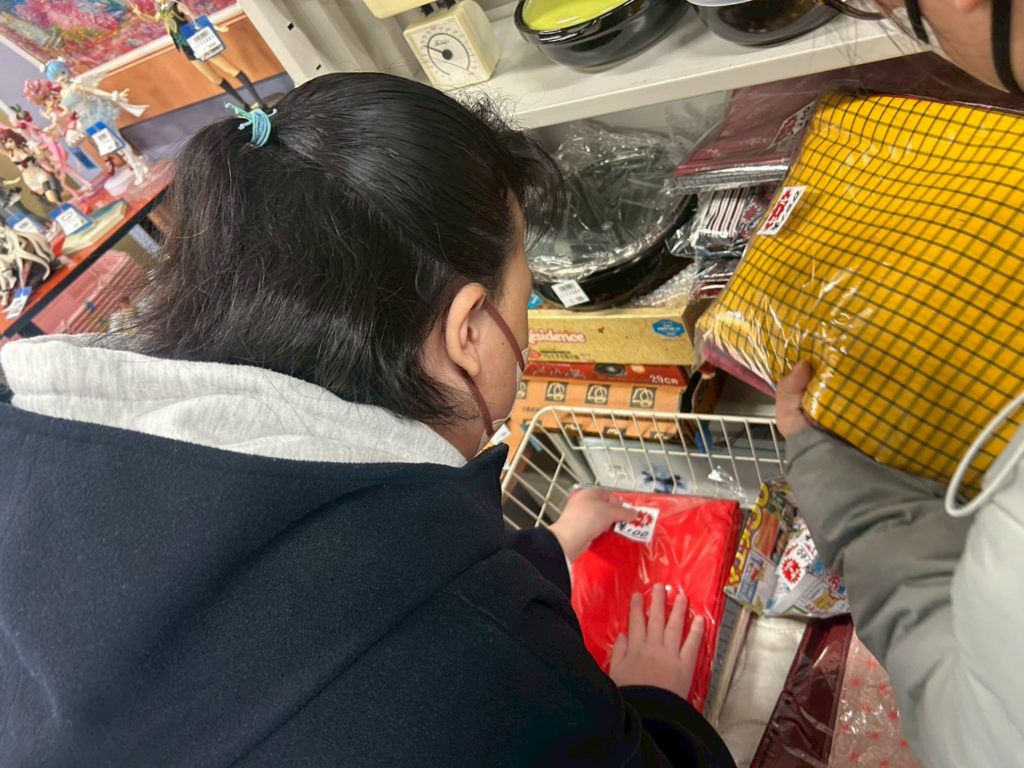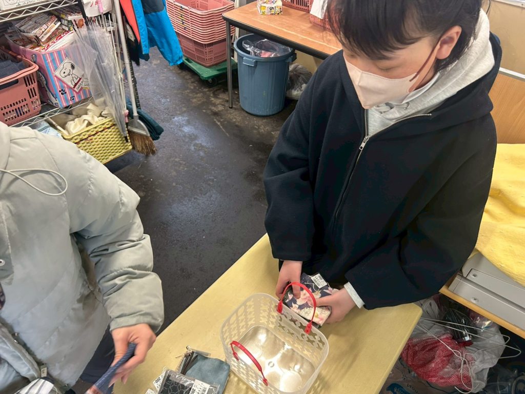 値札の上からセールの紙を貼る作業、カレンダーやタオルをくるくる丸めて輪ゴムで留める作業、商品が入っているカゴを綺麗に整頓する作業を行いました。