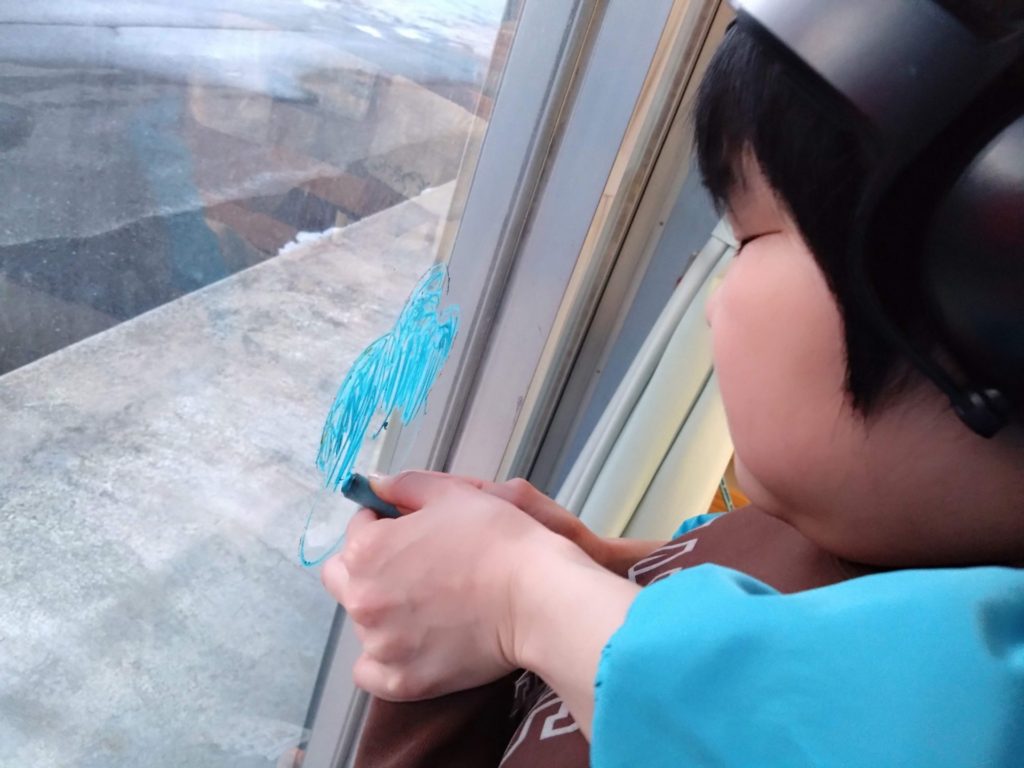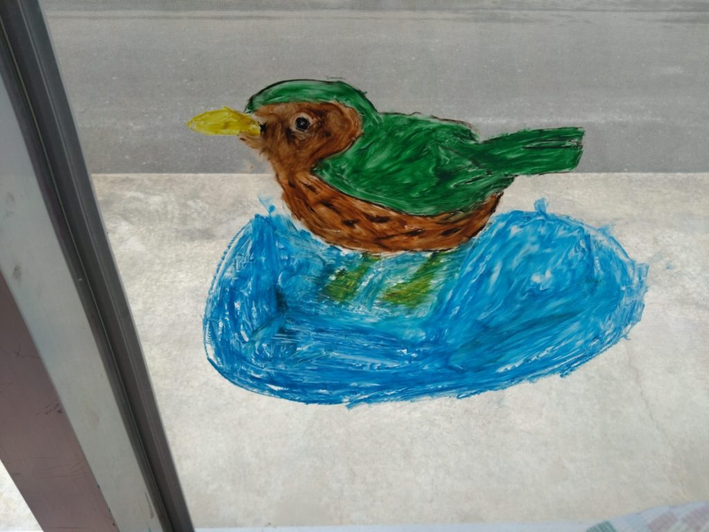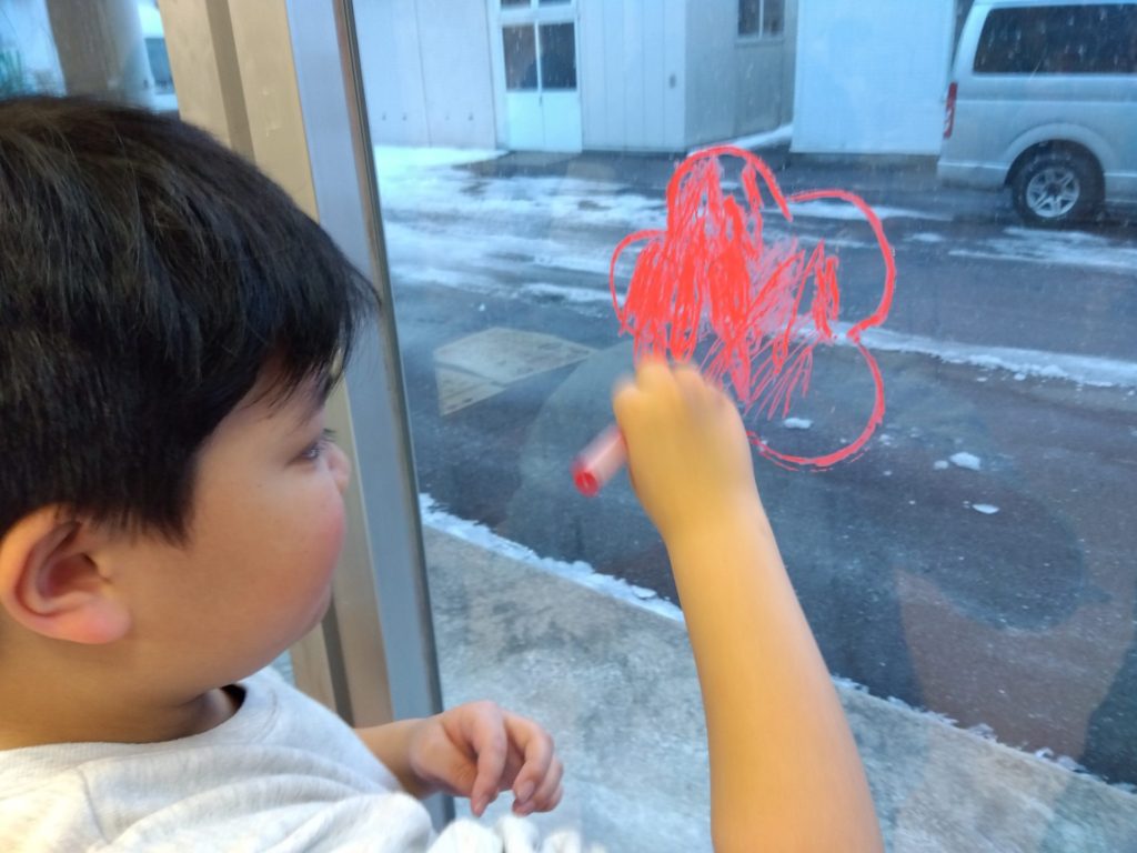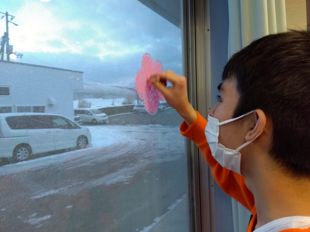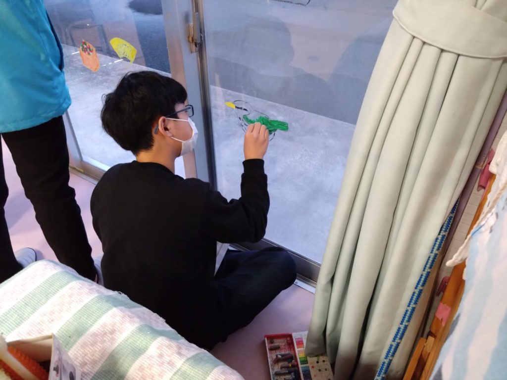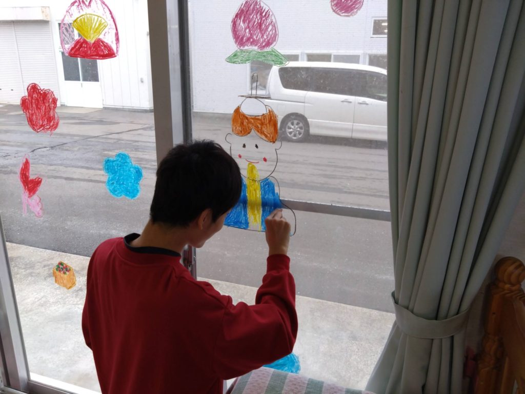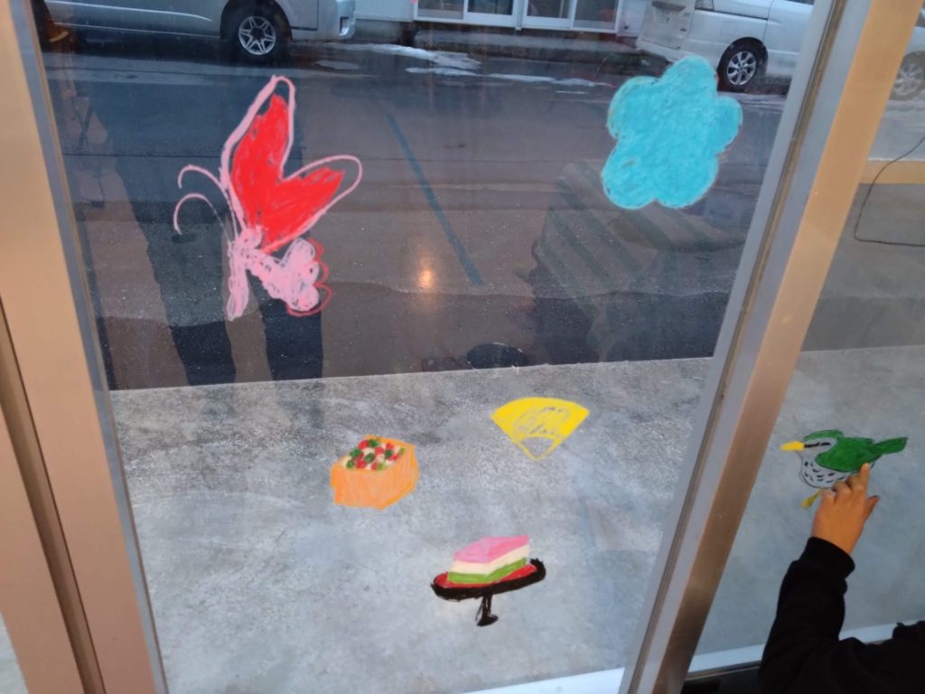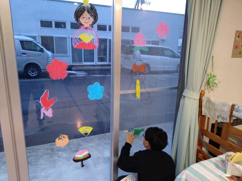 2月の節分に向けてのあの窓には鬼がたくさんいましたが、節分も終わったので今度はひな祭りに向けてお絵かきをしました。