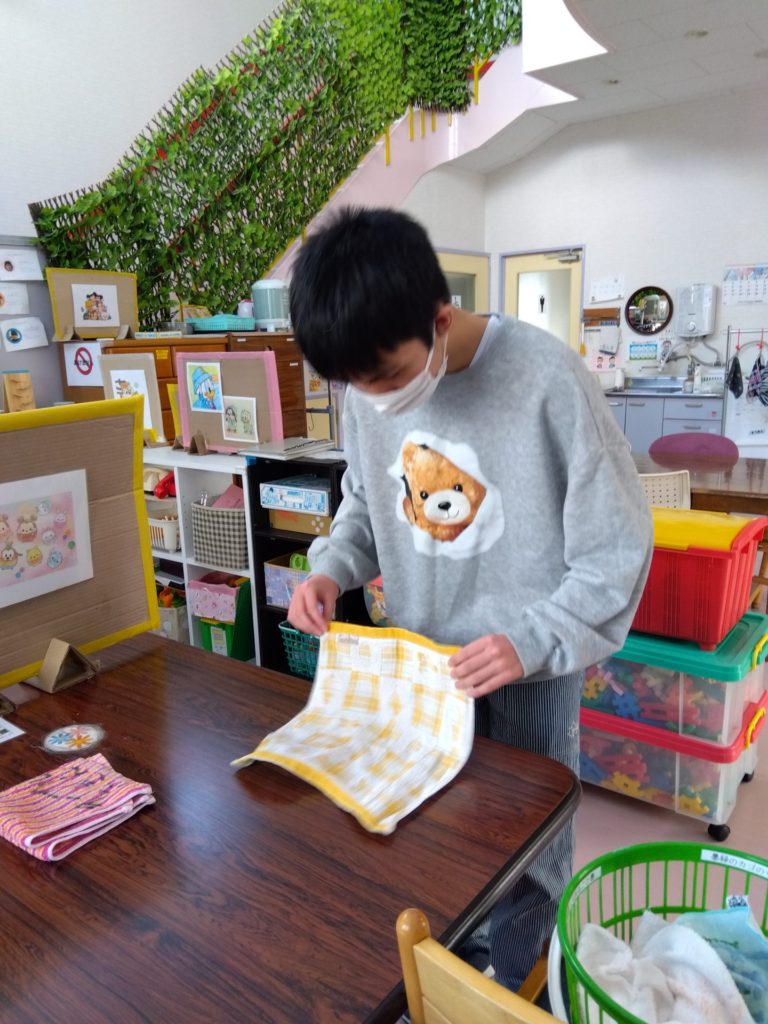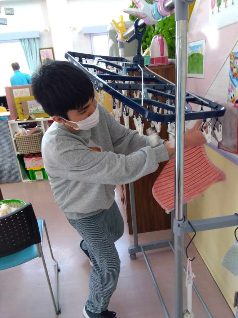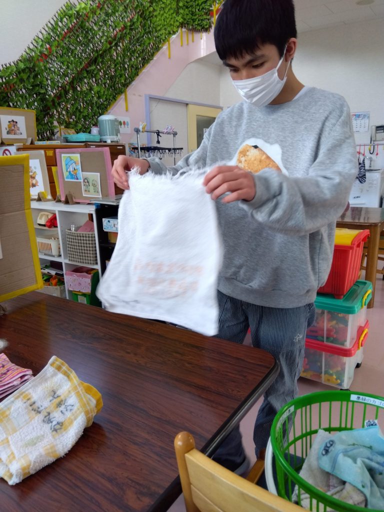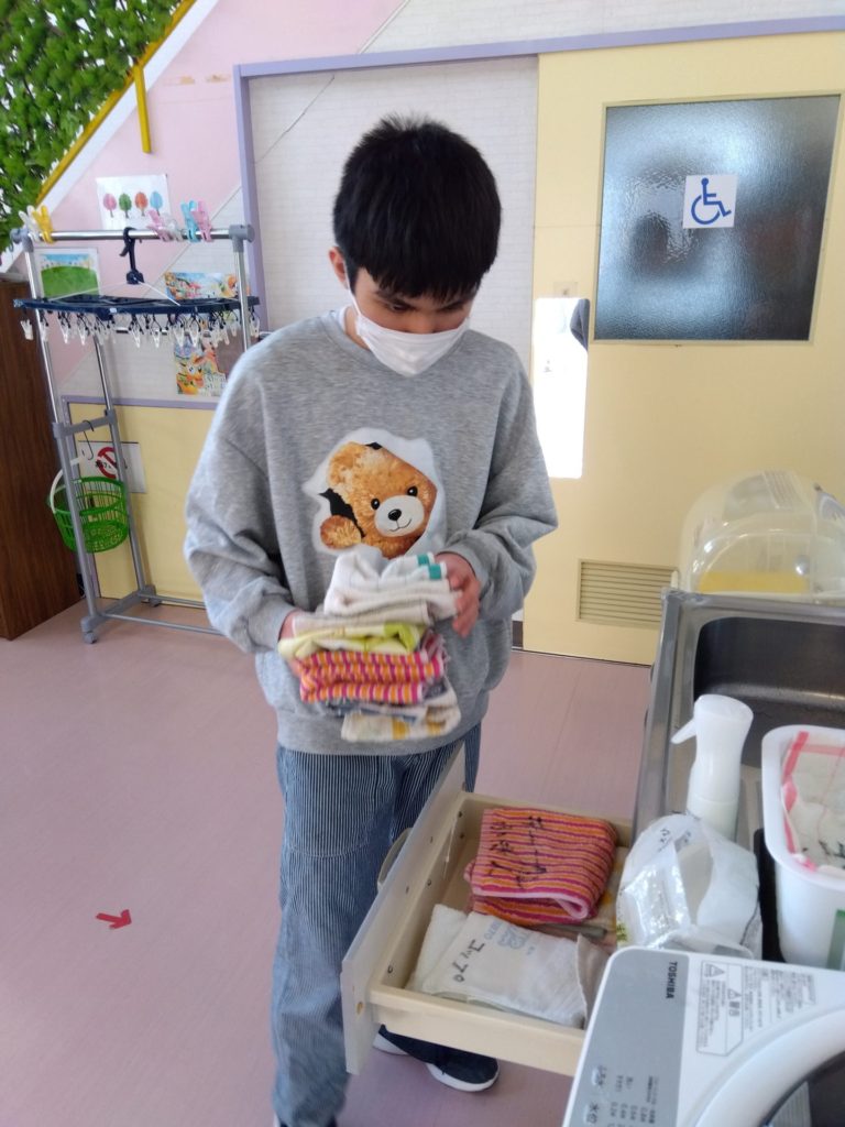 前の日に他の児童が洗濯して干した洗濯物を取り込みます。