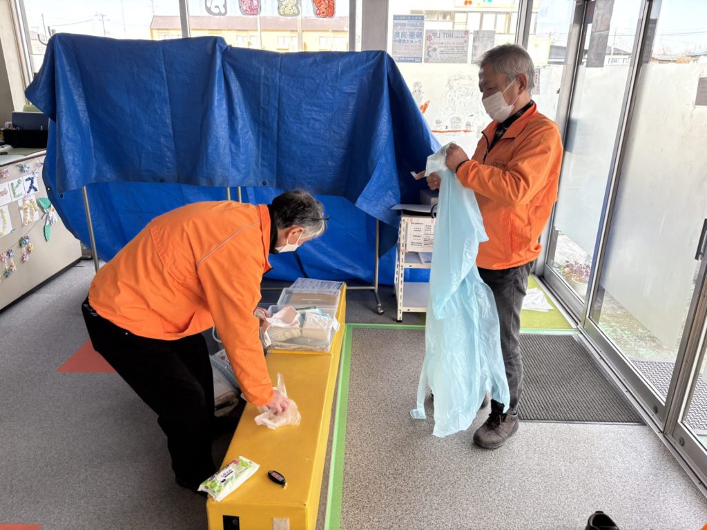 具体的には、感染症発生(疑い)を想定して、自分の役割りや準備、使用物品や連絡体制など、シナリオを作成しての実動しました。