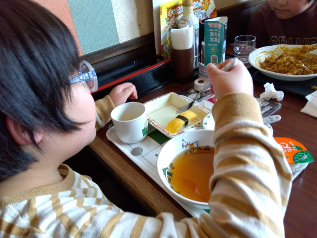 作品展を見た後は、外食をしました!フードコートには、マックやラーメン屋さんもあり、どうしようかと迷いましたが・・・「まだお腹空いてないよ…」という子もいたため(時間は11時10分頃でした💦)まるまつに移動して昼食を食べました!
