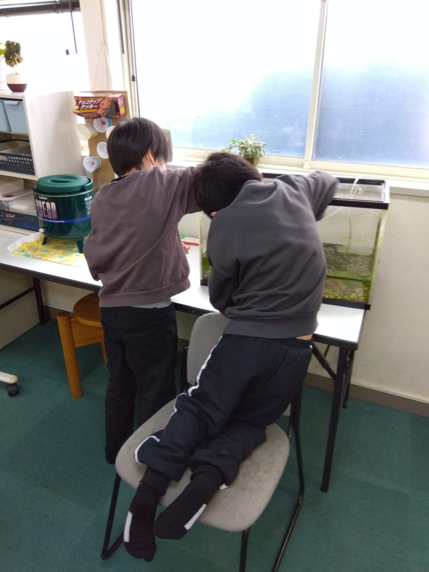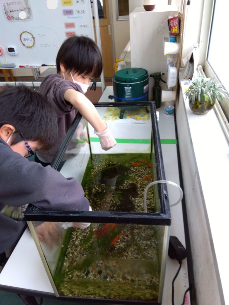 3人のおかげで、金魚さんたちはきれいな水槽の中を元気に泳いでいます。