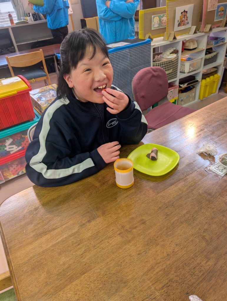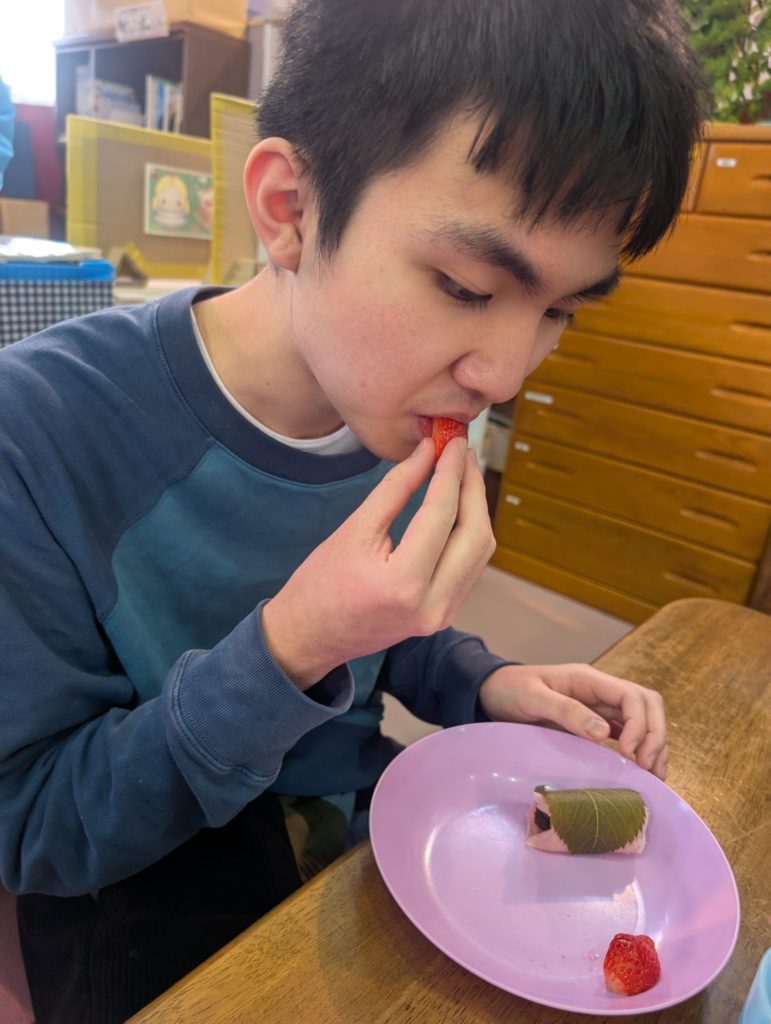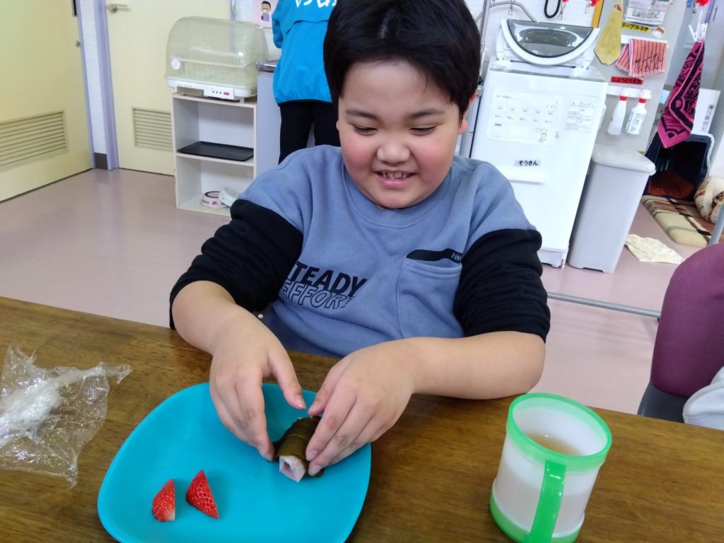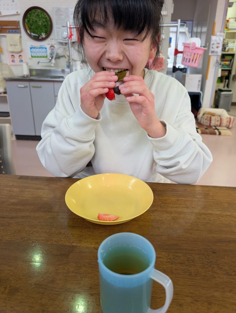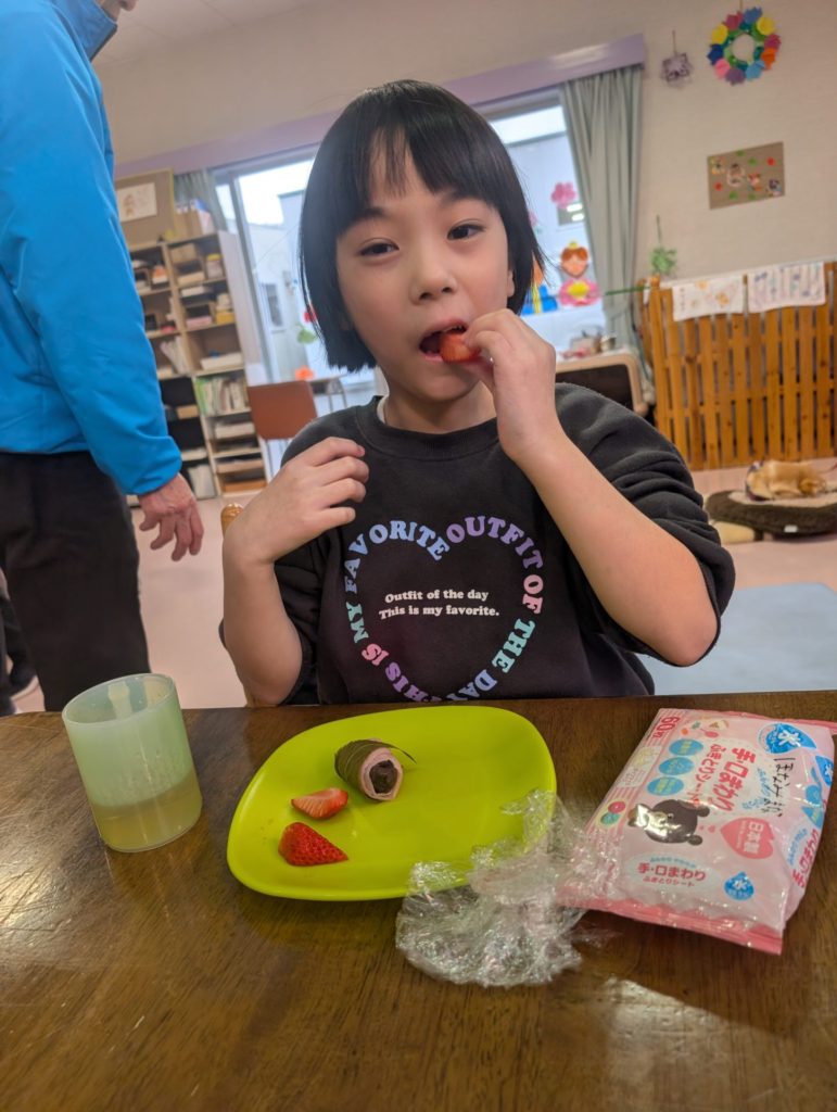 Sさんは🍓も一緒に巻いてこの笑顔😊 🍓落っこちそうだよ💦