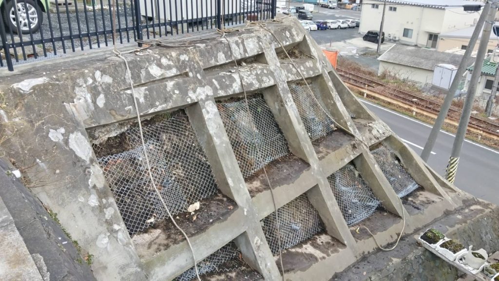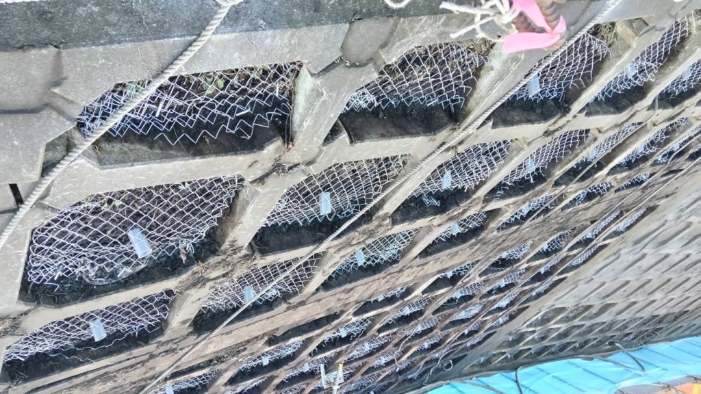 まず最初に飛散防止ネットを設置し、老朽化したコンクリートを撤去することなく、補強、再生する。1マスごとに土をかき出し、重機にてフレコンバックを入れ、鉄筋ネットを設置。マスの中心に水抜パイプを差し込んでいる。法面内部に水が溜まると圧が高まり、くずれる事があるからだ。作業員は外国の方でびっくりです。