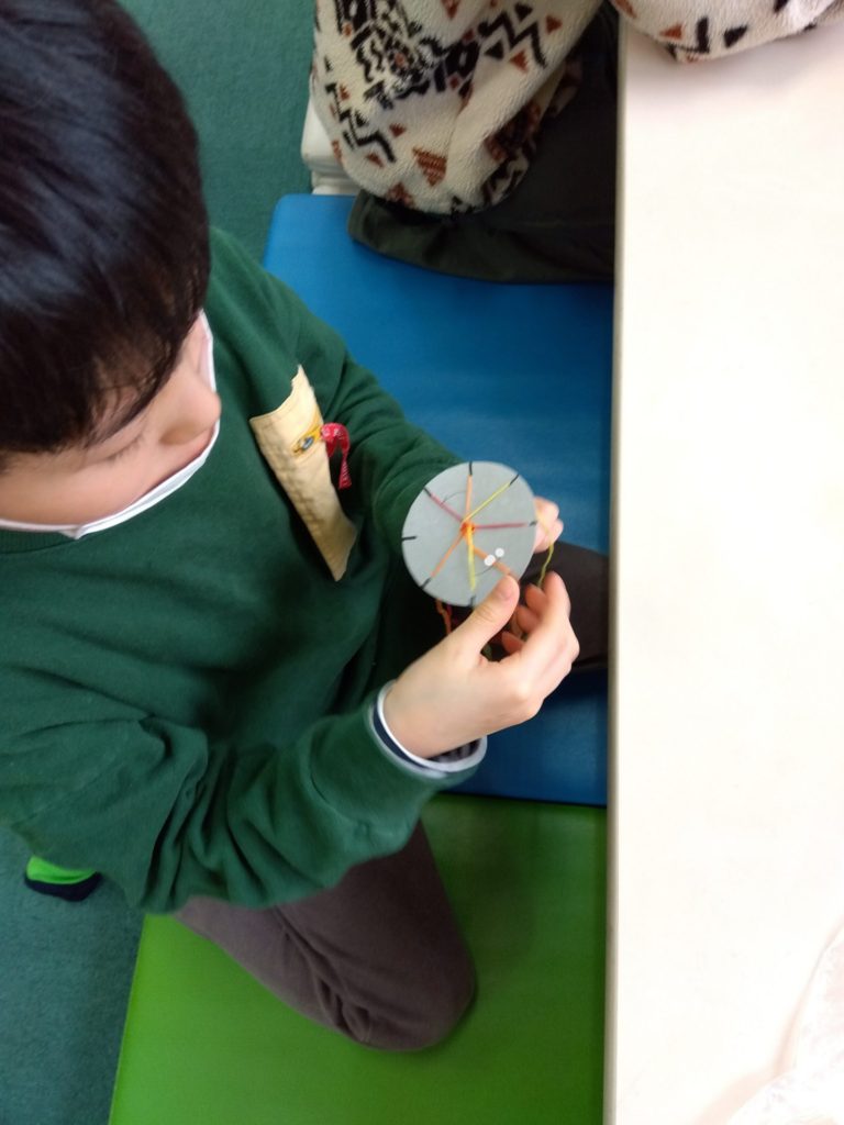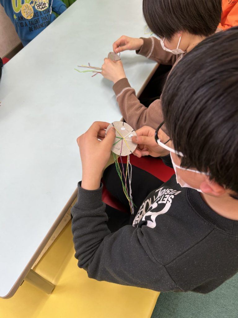 はじめは力の加減が上手くいかず、中心から出ている糸が全部抜けてしまったり引っ張り方が強すぎてなかなか長く編めなかったり…と、手こずっている子もいましたが、思いのほかみんな集中して取り組んでいました😄