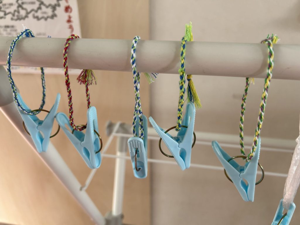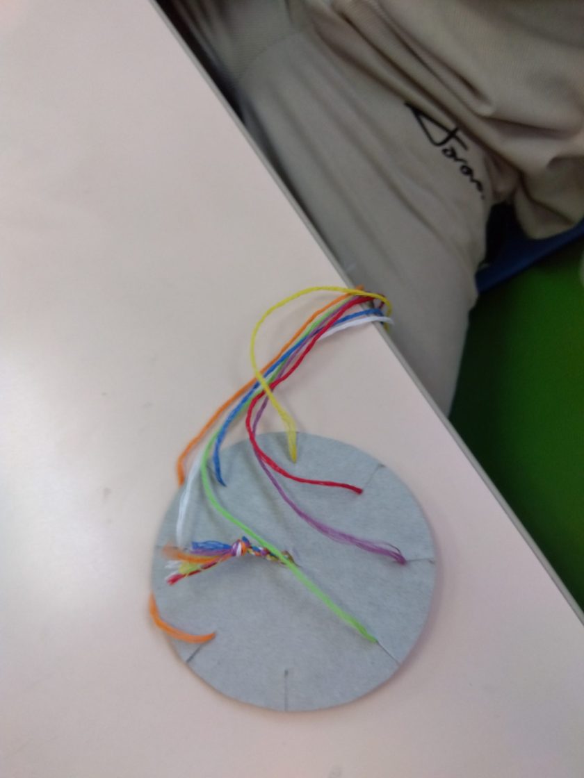 思いのほかポスターが早く仕上がり、またハンカチ掛けのミサンガ編みは「たのしい!😄」と好評だったので、じゃあ、最後はみんなでやってみよう!と全員で取り組むことにしました。