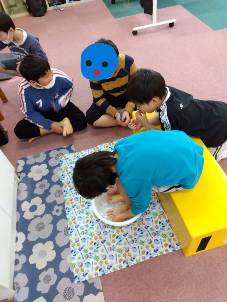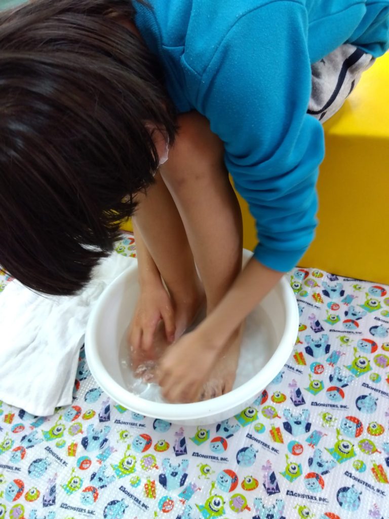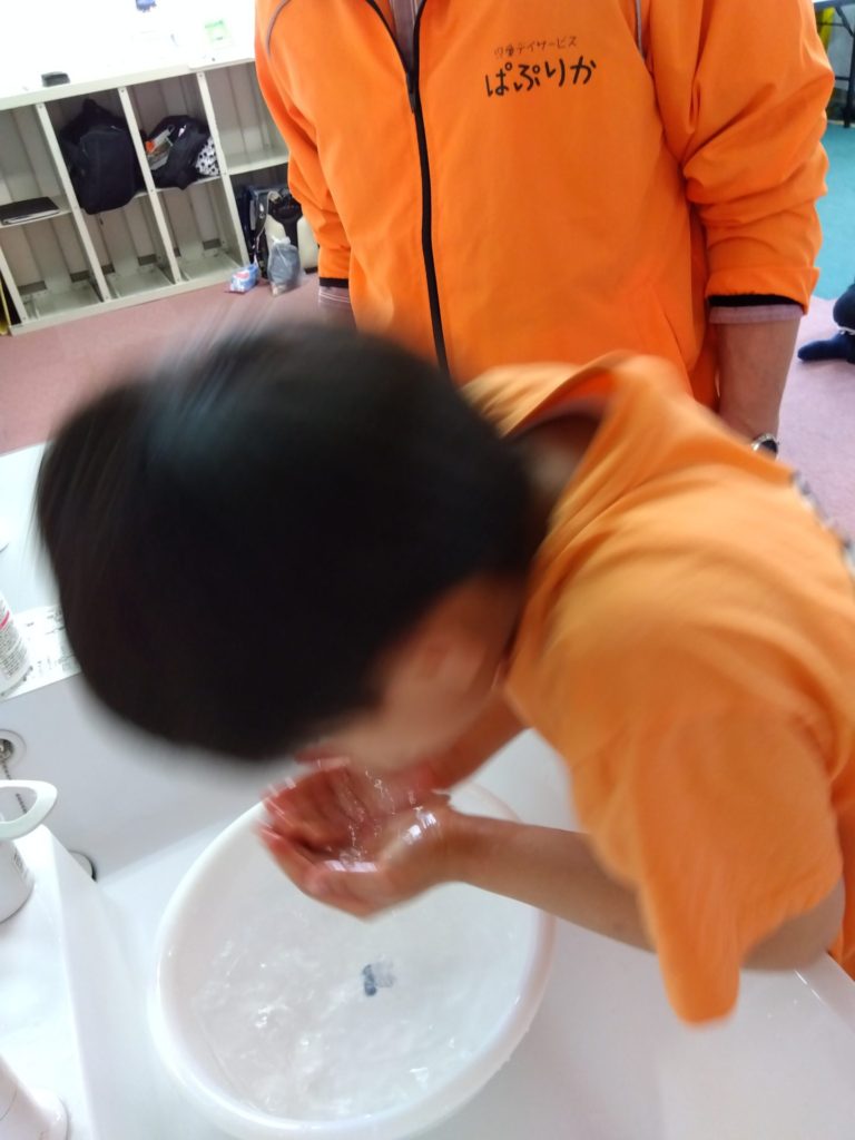 これも暖かめのお湯を準備して、手でお湯をすくって顔にかけて洗う方法を練習しました。