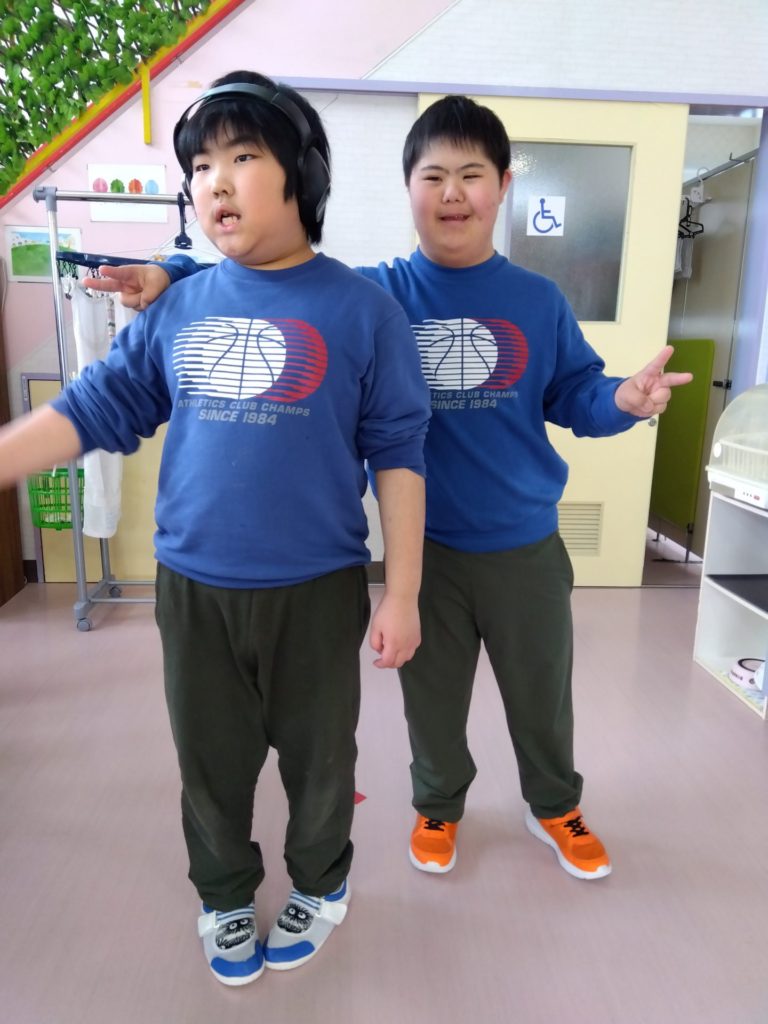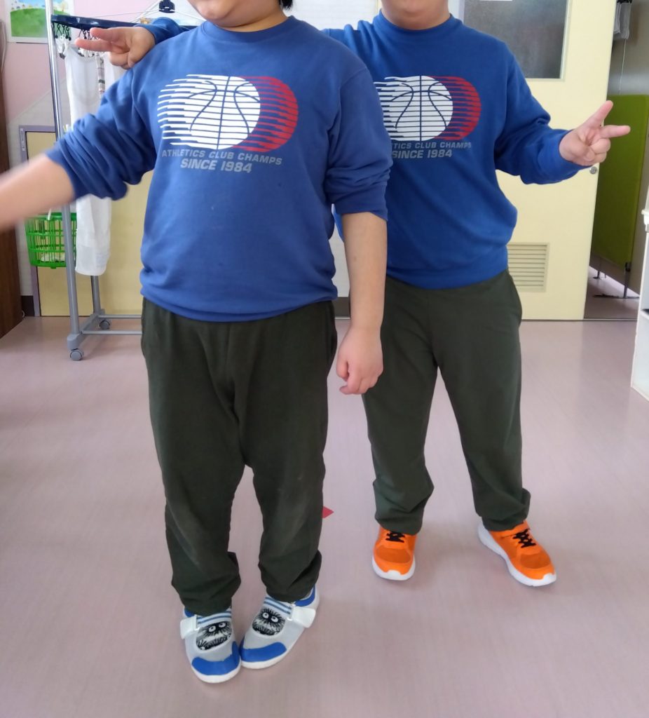 のあ:のあの双子ちゃん🧑🤝🧑トレーナーもズボンの色も全く一緒の2人…誰か分かりますか~?正解は・・・AさんとSさんでした~!!!この日はズボンの色もたまたま一緒でした!(^^)!なんともうひとつ同じ服を持っています🤭まるで双子みたいですね😄 かわうそ